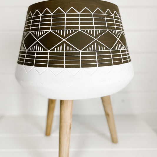Large Brown/White Etched Pot on Wooden Legs