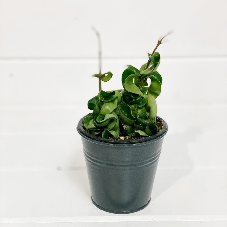 Often called a Wax Plant, the Hoya plants are easy to care for. The Hoya Carnosa variety consists of dark green, large, almond shaped leaves which grows on long vines that will eventually put out creamy white flower clusters.